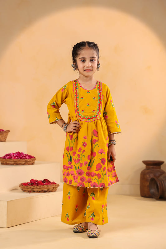 Girl Genda Phool Print Kurta Set - Mustard Yellow