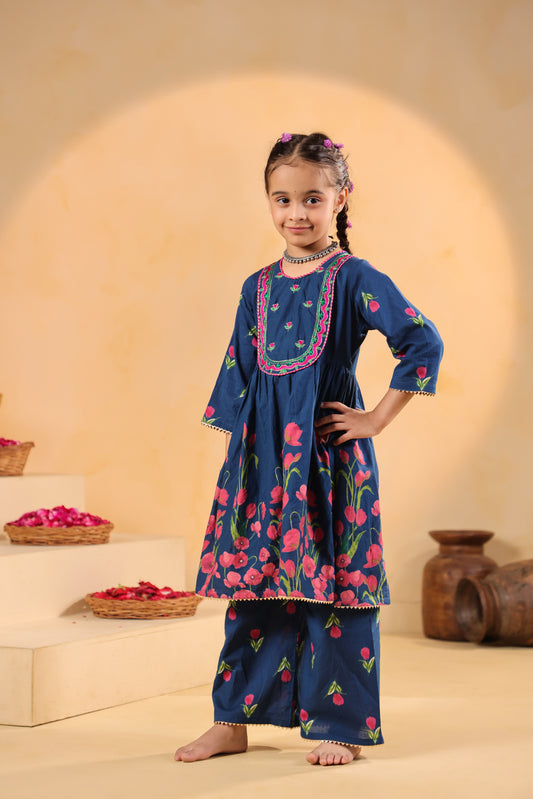 Girl Genda Phool Print Kurta Set - Teal Blue