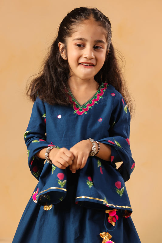 Girl Gulabo Floral Embroidered Skirt Top Set - Teal Blue