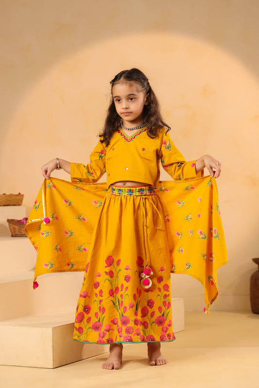 Girl Gulabo Floral Embroidered Skirt Top Set - Mustard