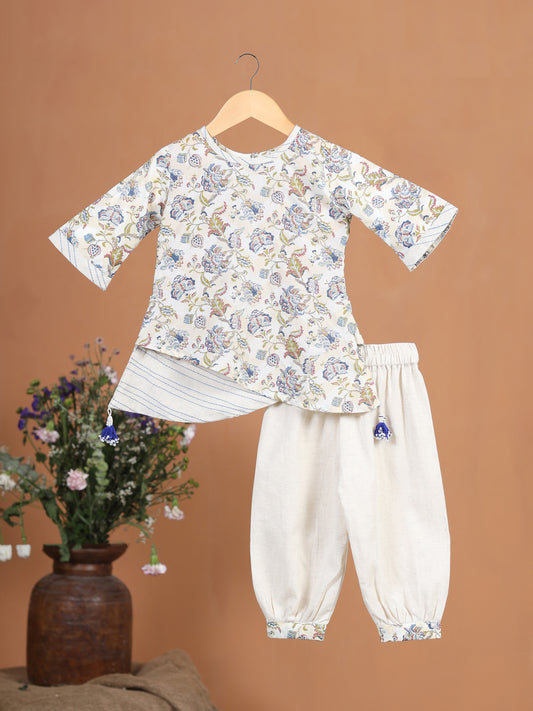 Girl Floral Hemming Kurta Set - Beige