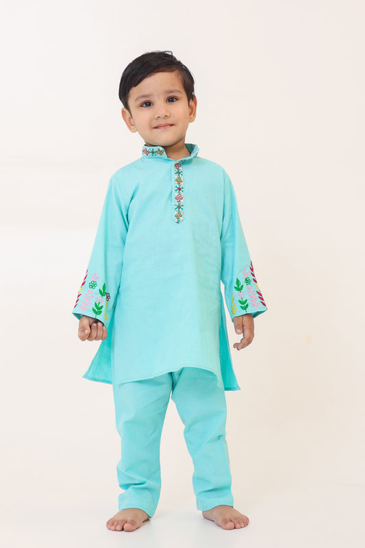 Boy Appliqued Kurta Pyjama Set- Turquoise