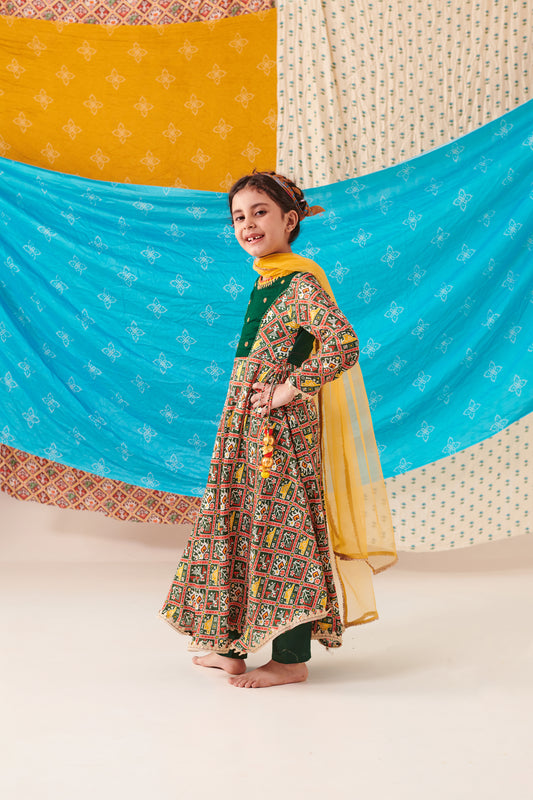 Girl 3pc Patola Anarkali Kurta Set-Bottle Green