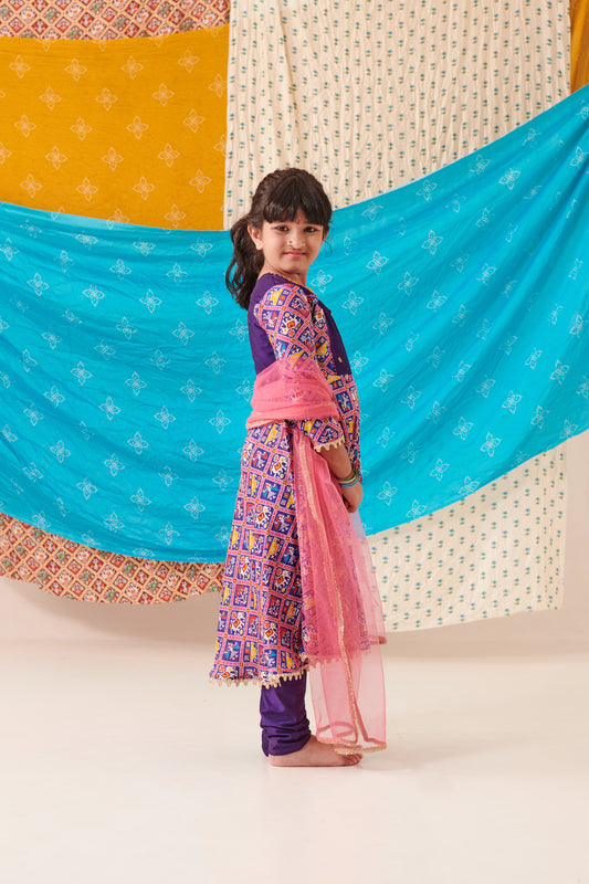 Girl 3pc Patola Anarkali Kurta Set-Purple