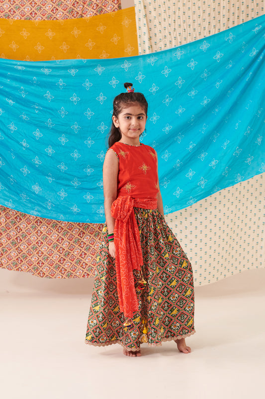Girl Dhola Maru Floral Jaal Suit Set-Maroon and Pink