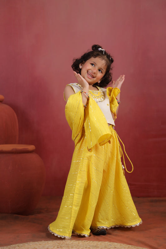 Girl Stripe Zari Embroidered Skirt Top Set - Lemon Yellow
