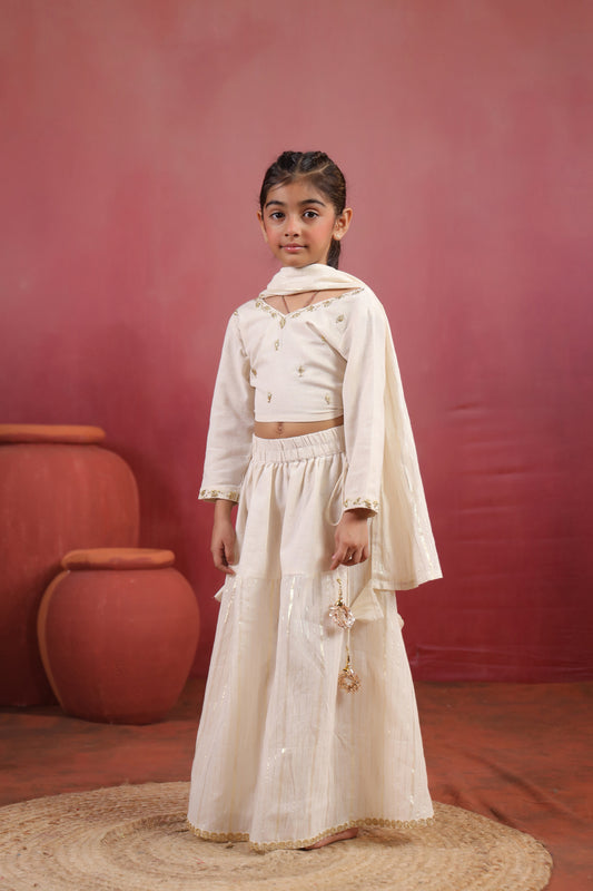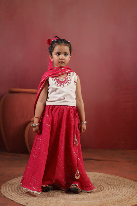 Girl Dhola Maru Floral Embroidered Skirt Top Set - Beige & Green