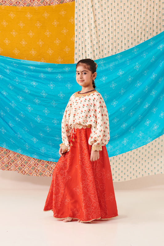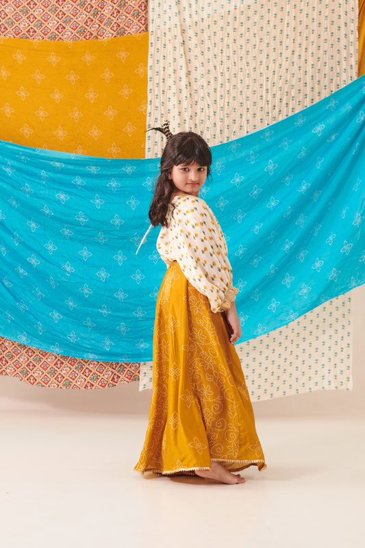 Girl Panelled Bandhani Skirt Set-Mustard Yellow
