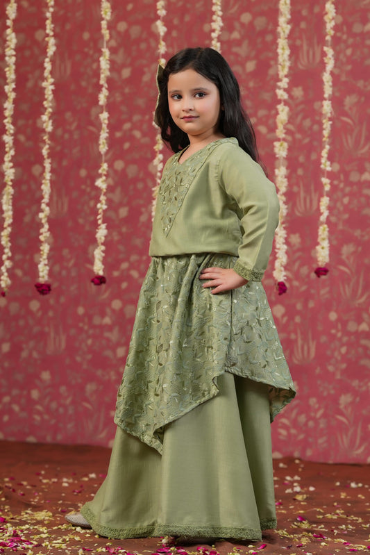 Girl Gulabo Floral Embroidered Skirt Top Set - Mehandi Green