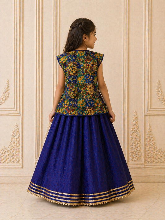 Girl Maharani Zari Banarsi Skirt Top and Cape Set - Royal Blue