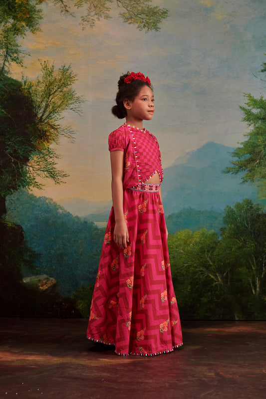 Girl Dhola Maru Floral Jaal Suit Set-Maroon and Pink