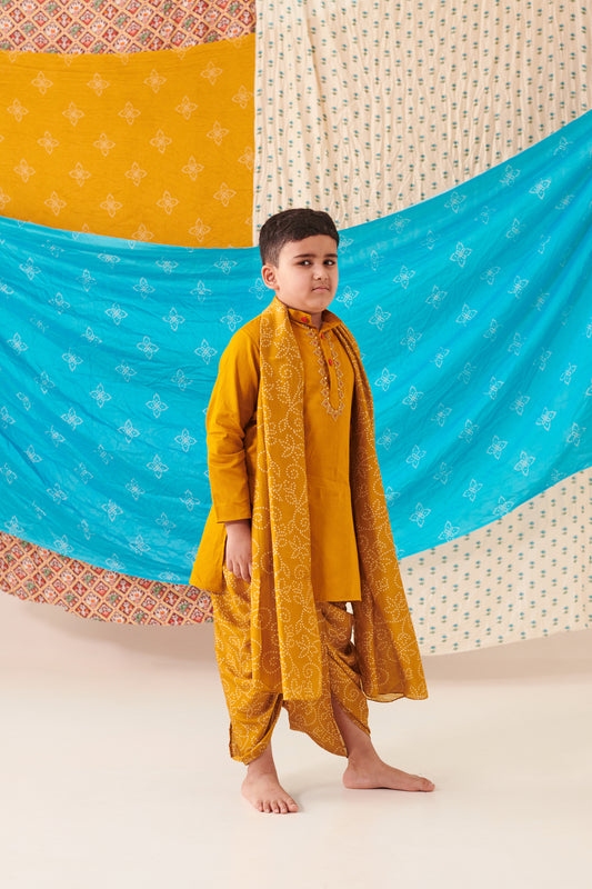 Boy Bandhani Kurta Dhoti Set-Mustard Yellow