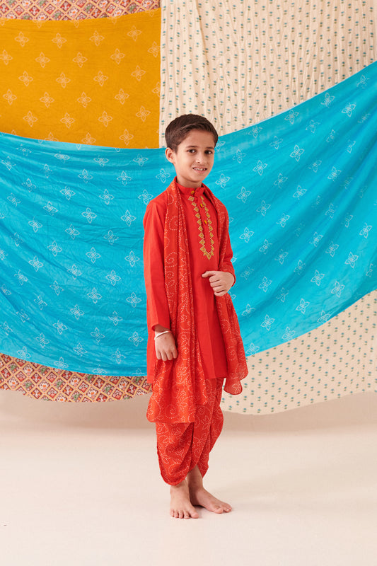 Boy Bandhani Kurta Dhoti Set-Red