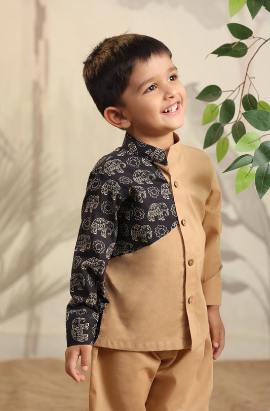Boy Black Elephant Shirt Set - Beige