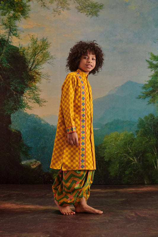 Boy Bandhani Kurta Dhoti Set-Mustard Yellow