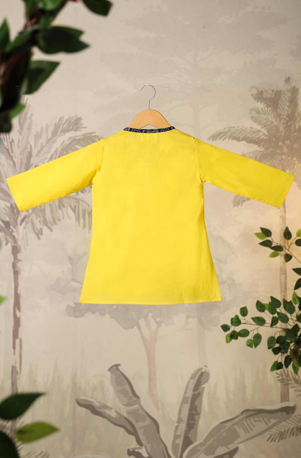 Kurta : Made of 100% cotton with highlighted motifs all around with contrast pipein and strings to tie .