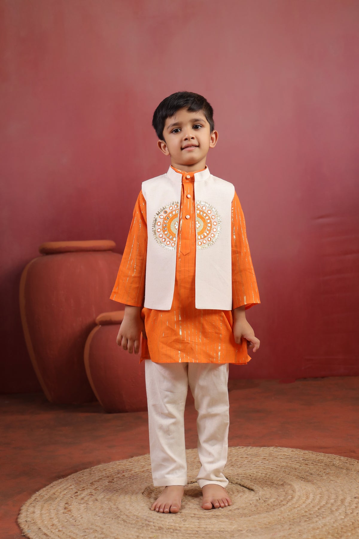 Dress your gentleman in this unique 3-piece bundi kurta set in most preferred all time wear color. The hand work jacket adds an ethnic touch to this attire with classic lurex kurta and plain bottom. This is perfect for sophisticated looks on any festivities. This set can be worn without jacket also.