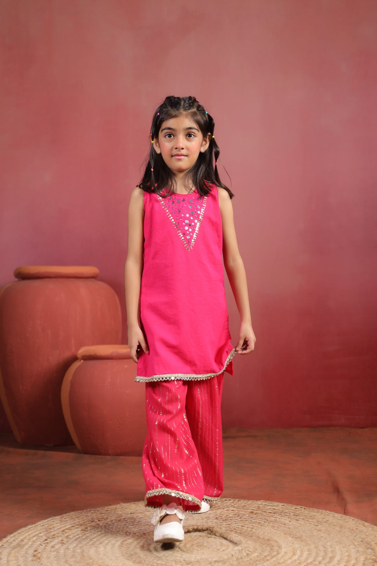 Girl Royal Mirror Kurta Palazzo Set - Magenta