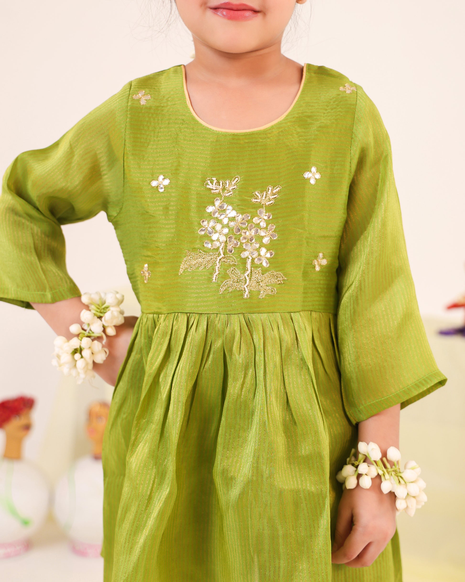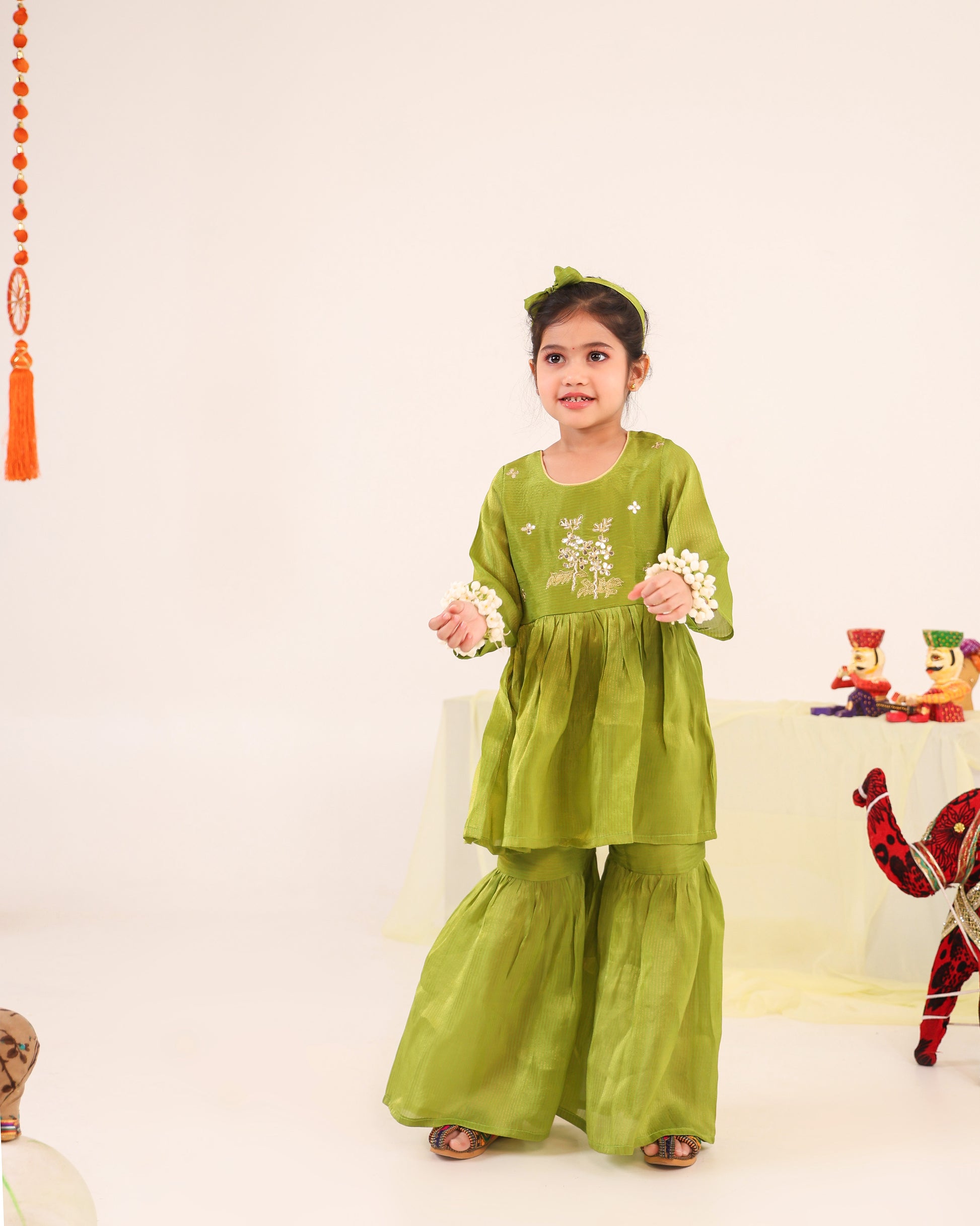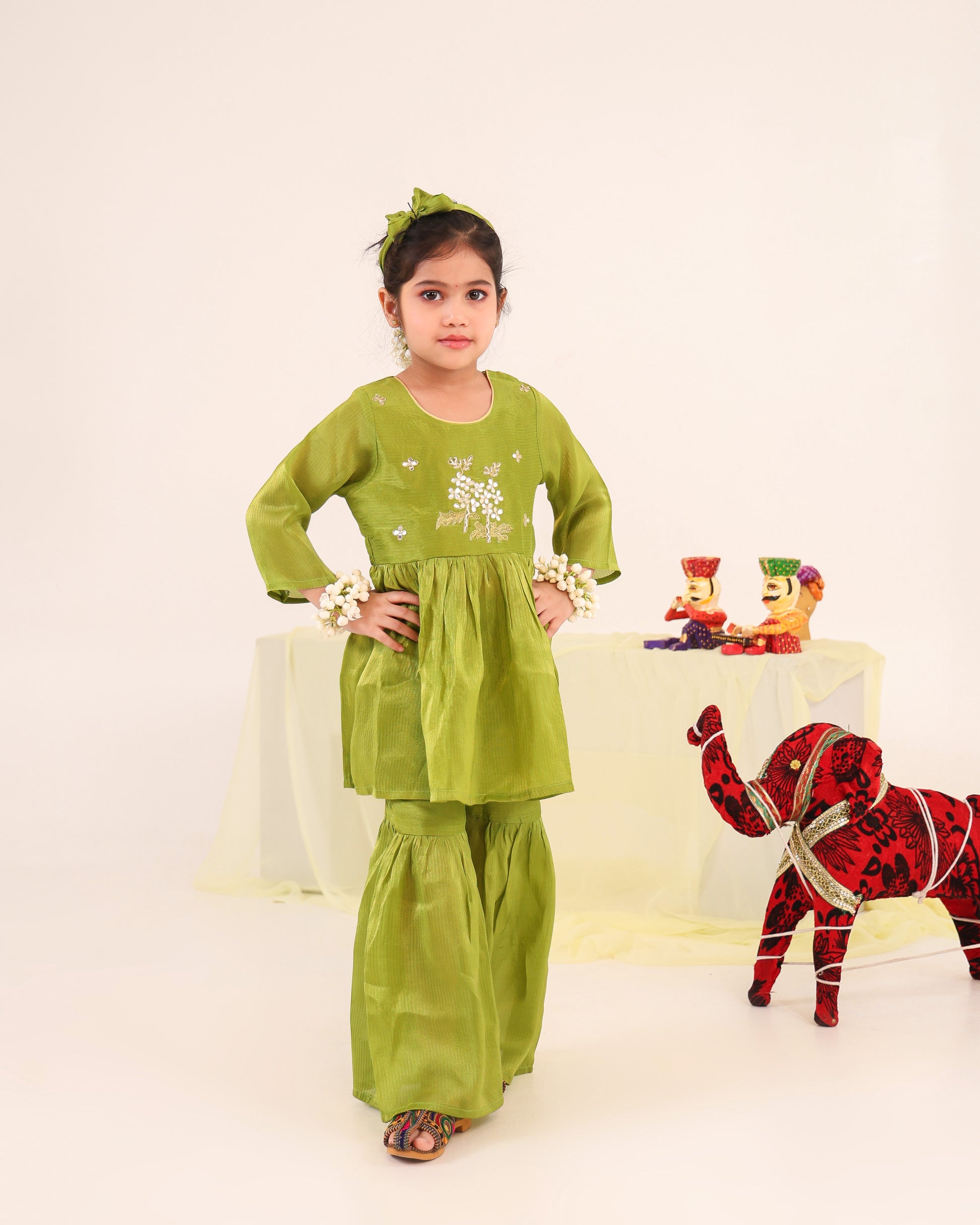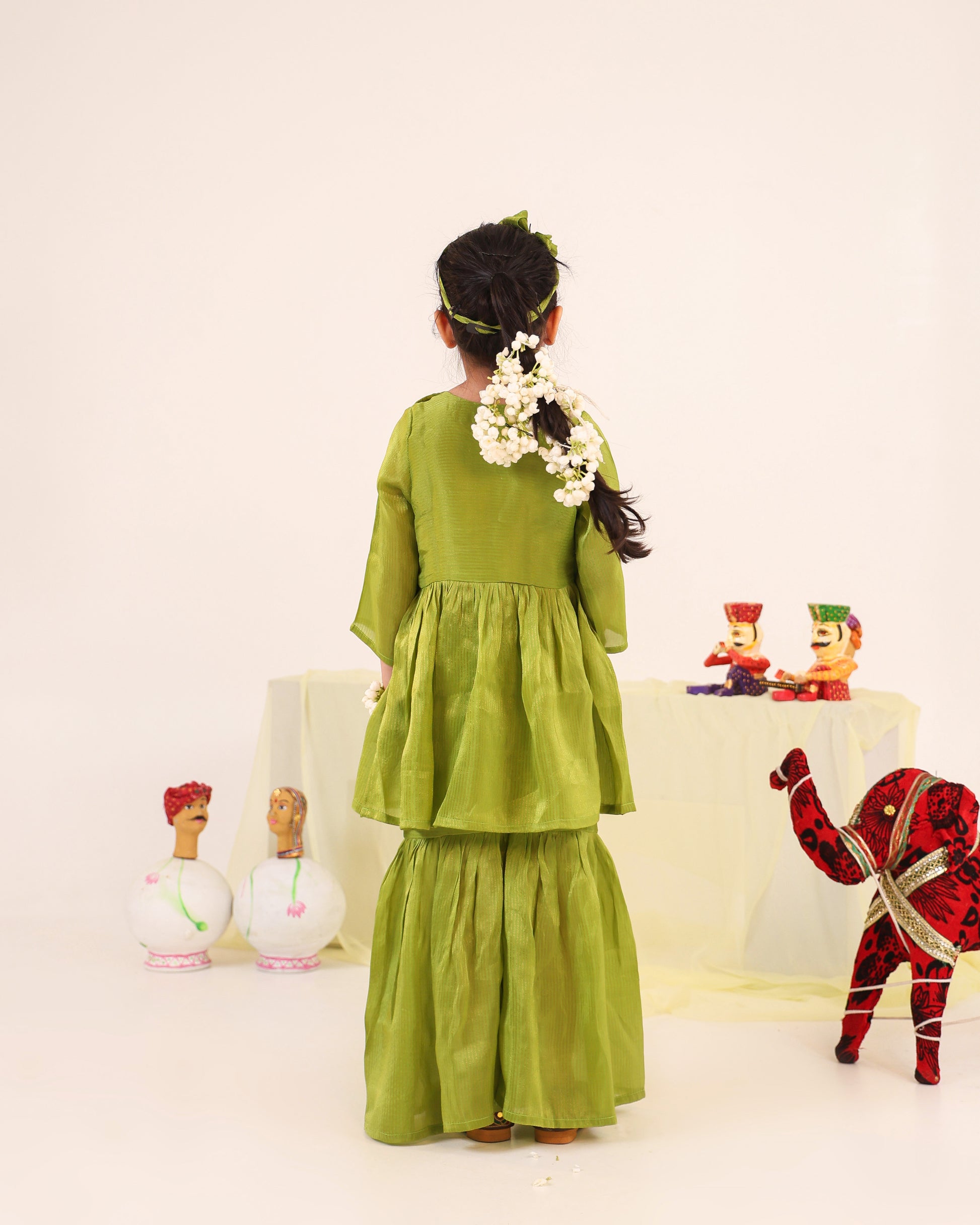 Girl Striped Zari Embroidered Sharara Set - Minty Green