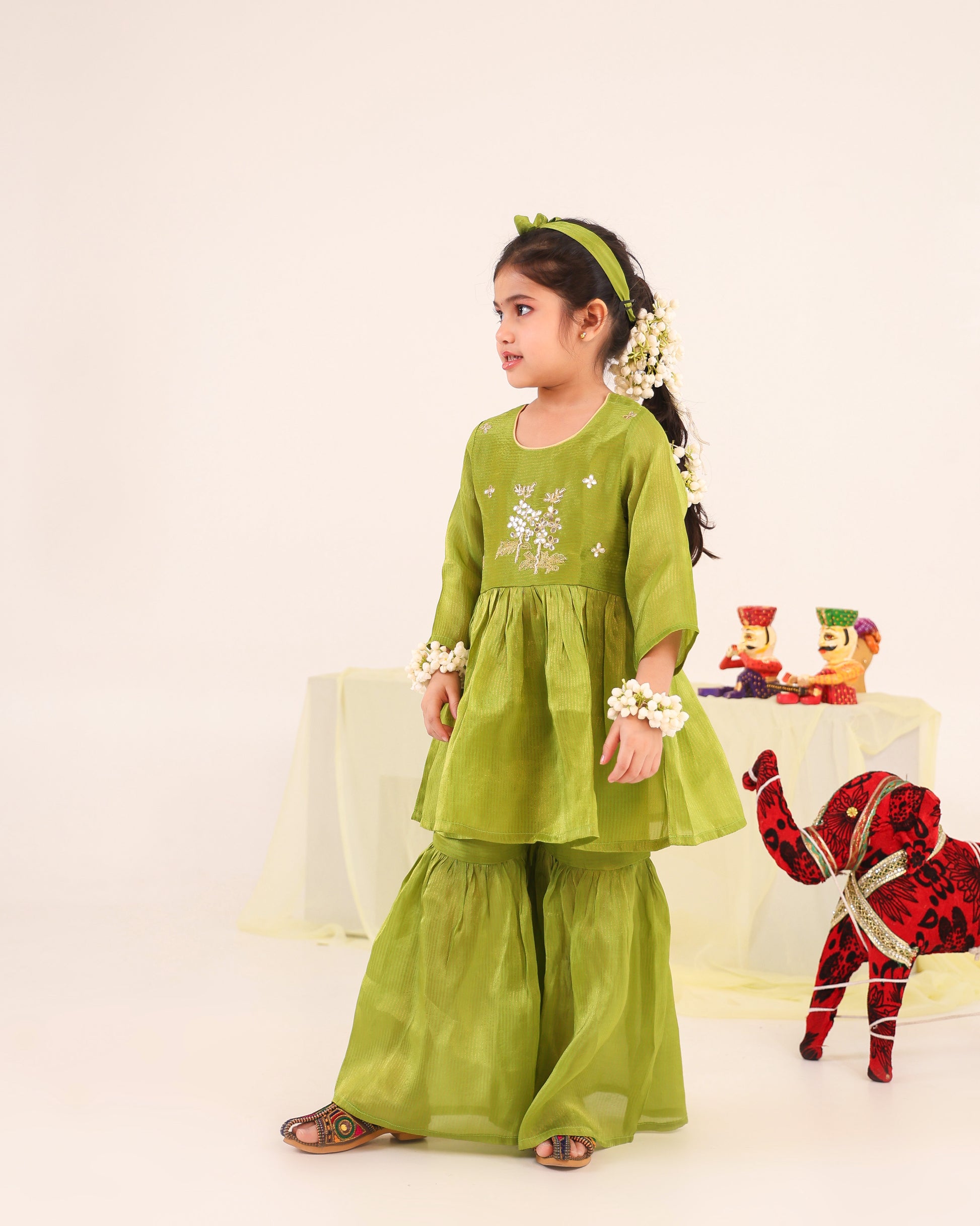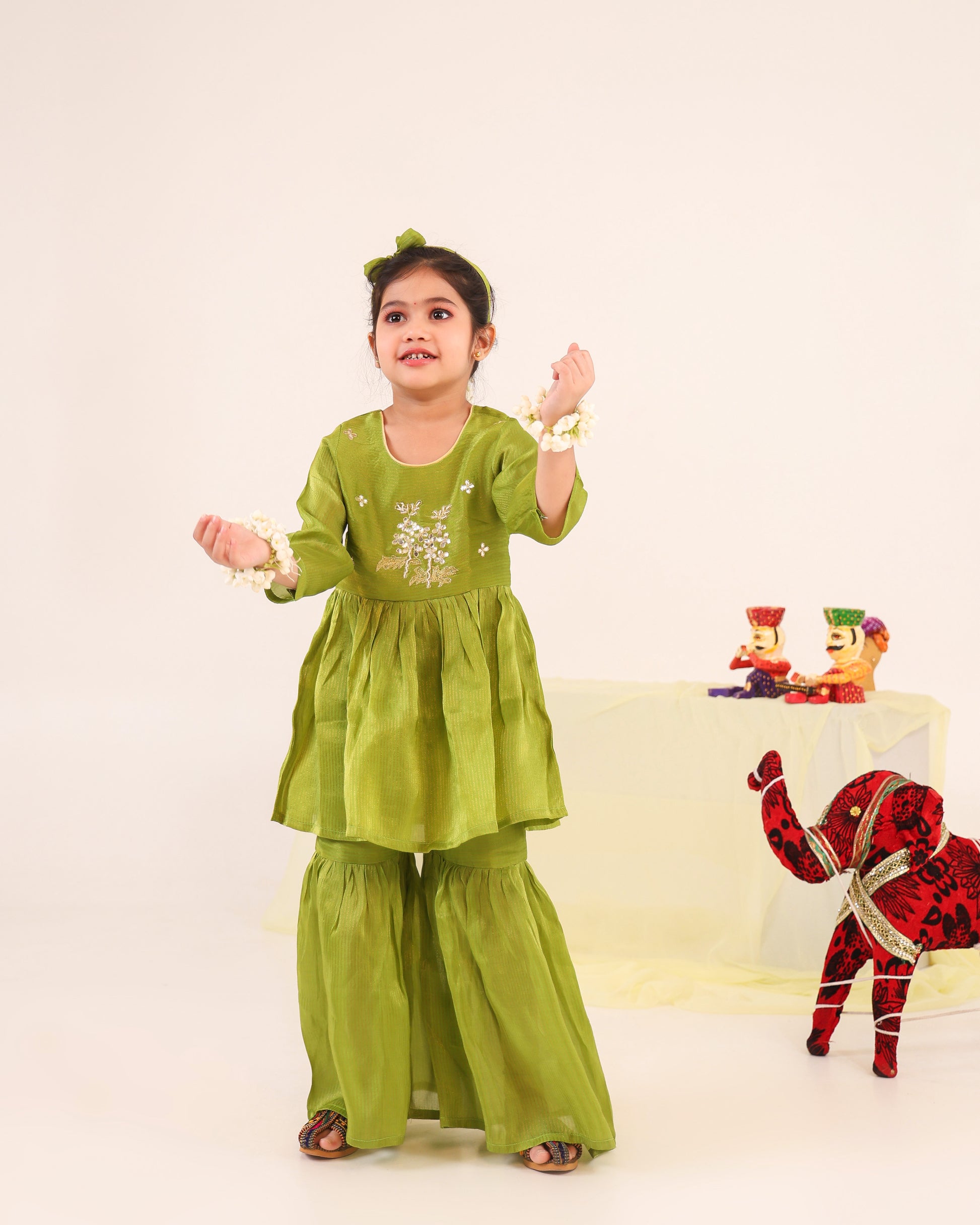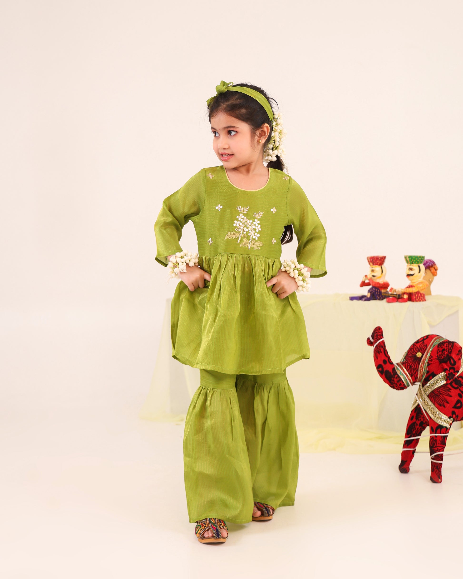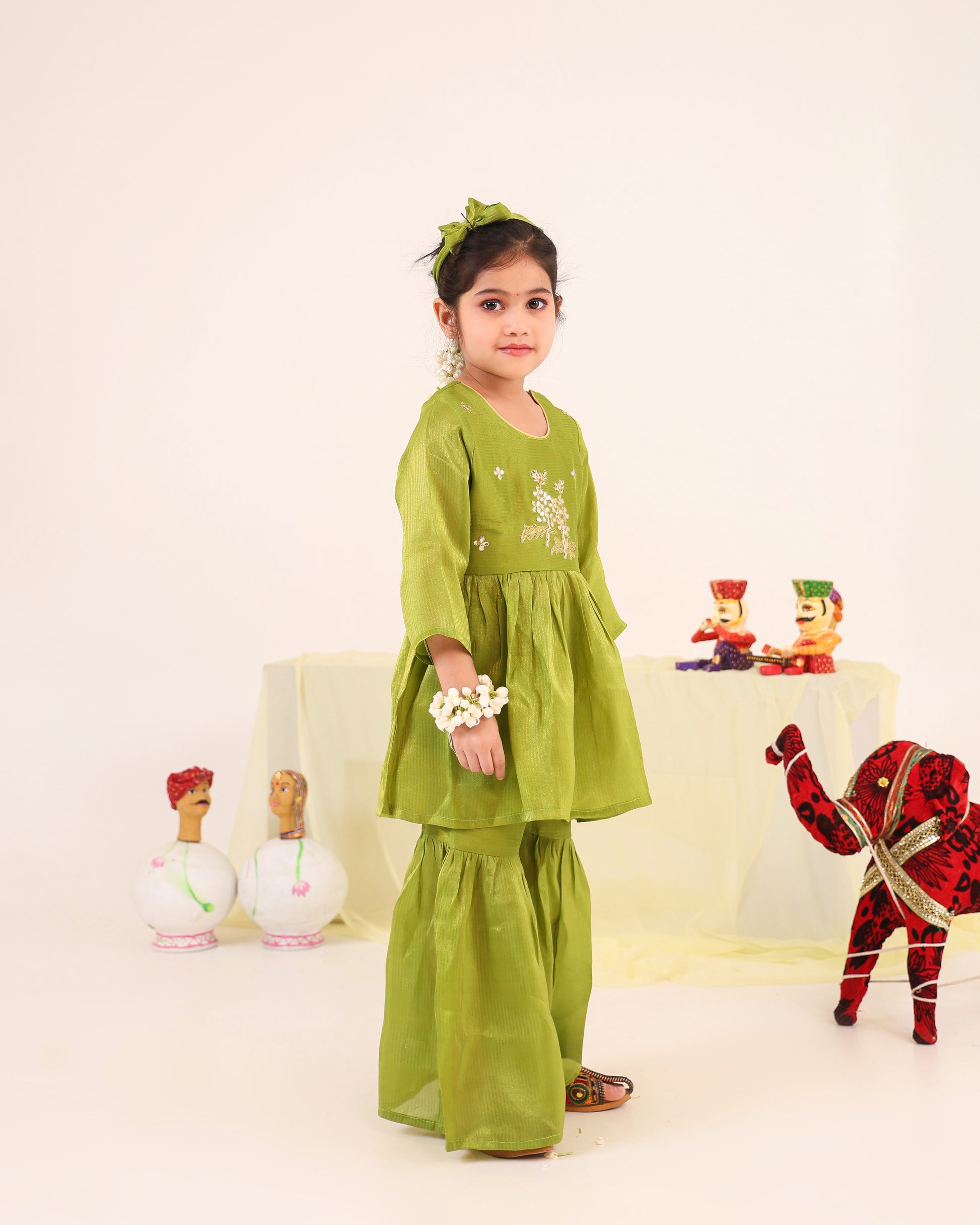 This kurta style sharara set is one of the all time favorite for all festivals . The easy to wear kurta with a elasticated sharara with zari embroidered motif make it traditional and unique. Kurta also adorns its beauty by special laces and embroidered yolk with stripy flary bottom.