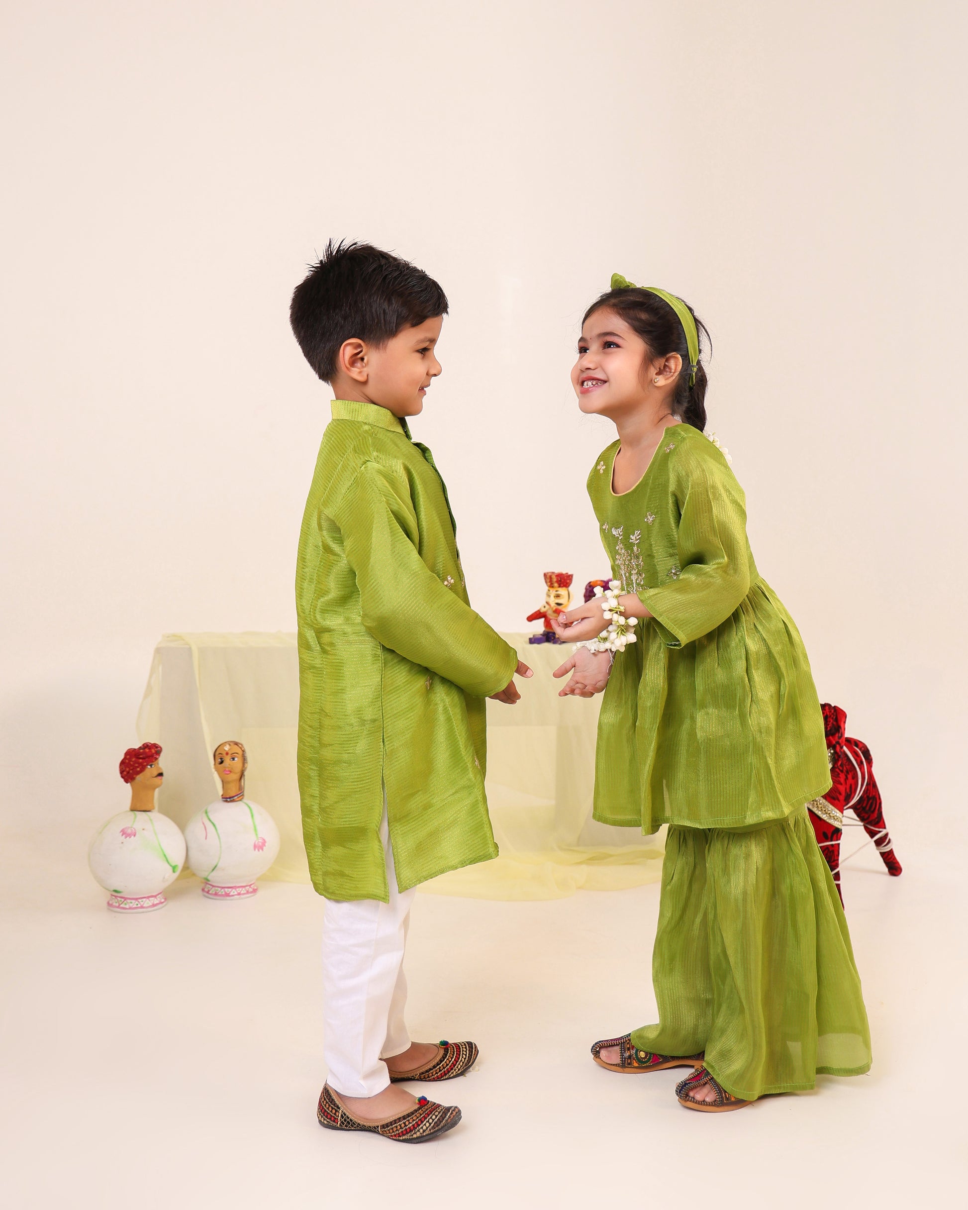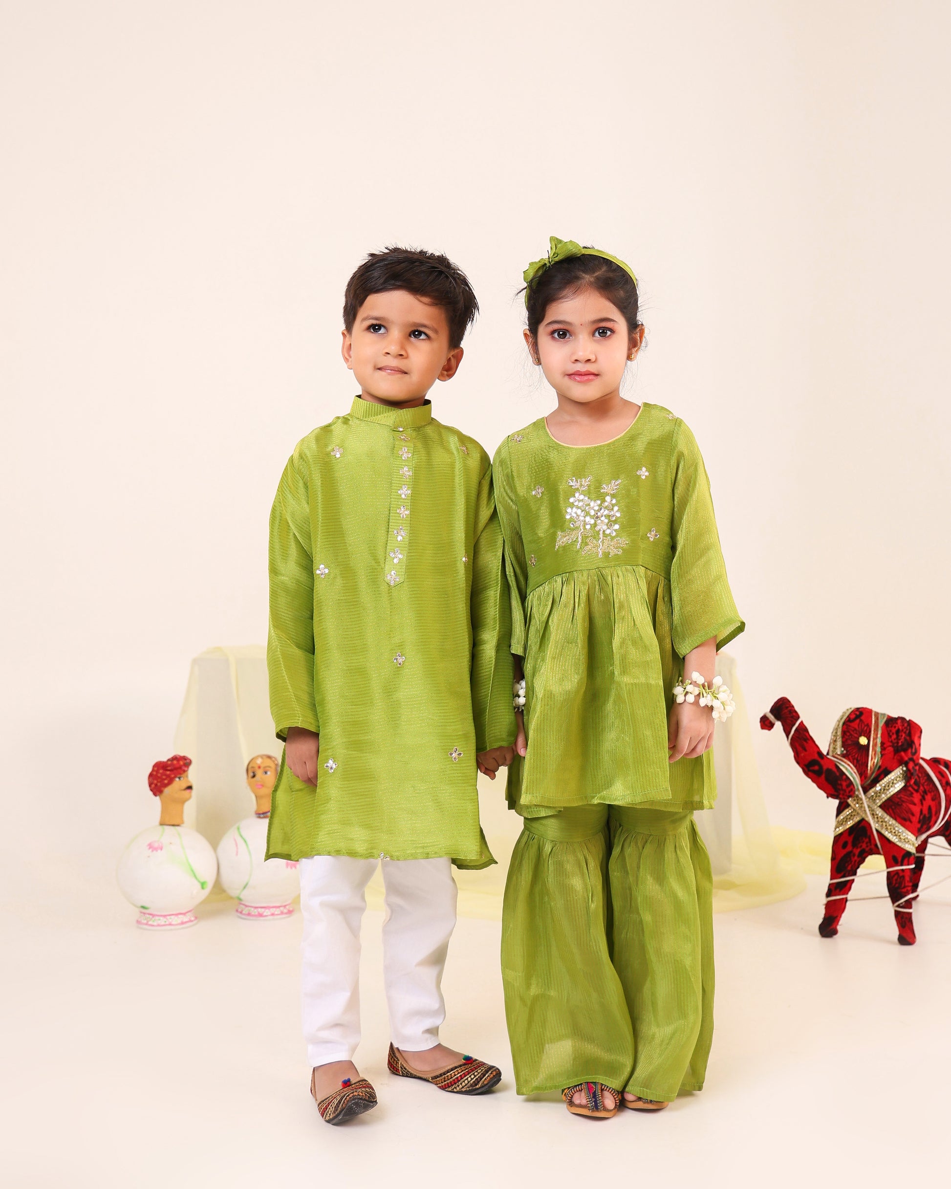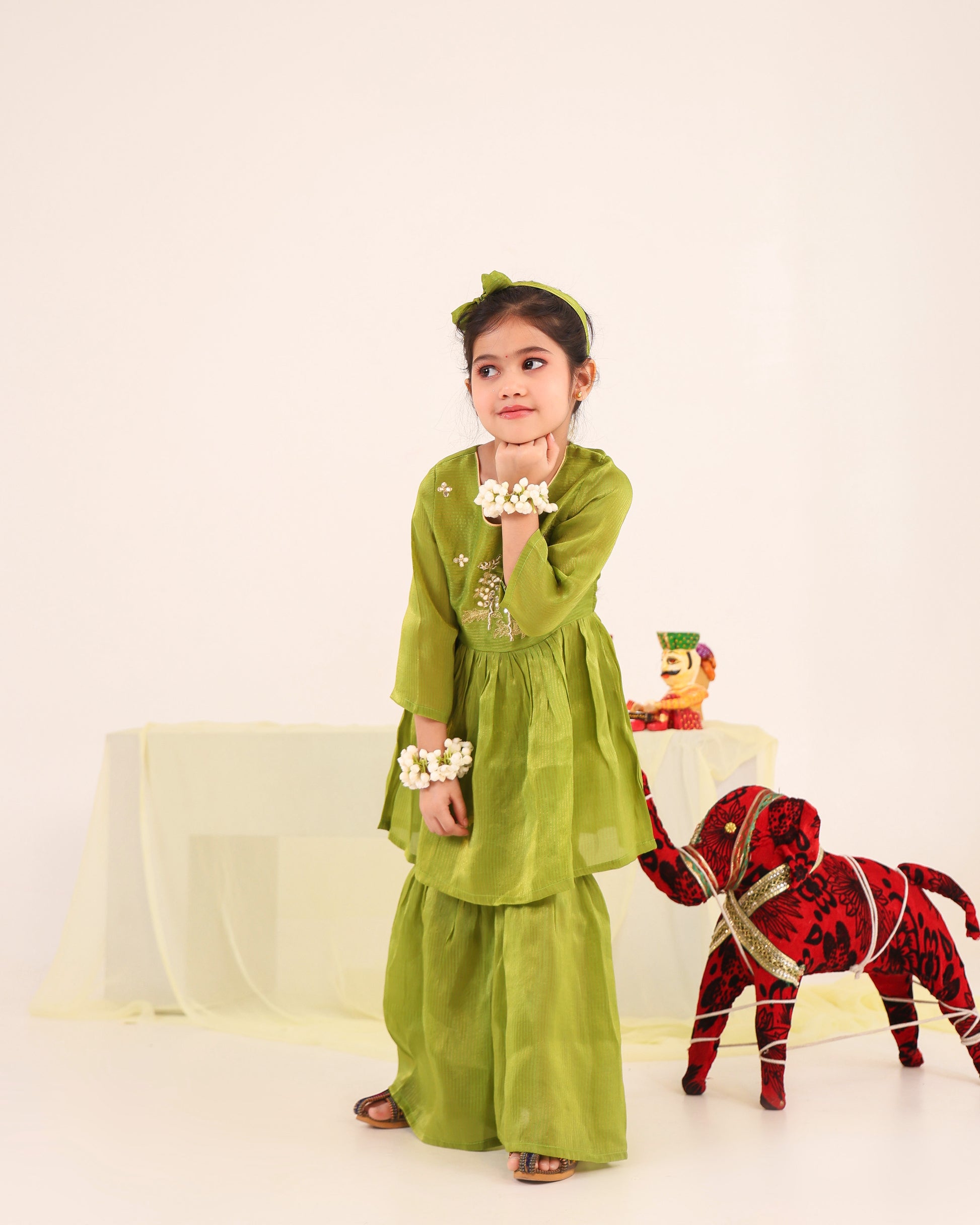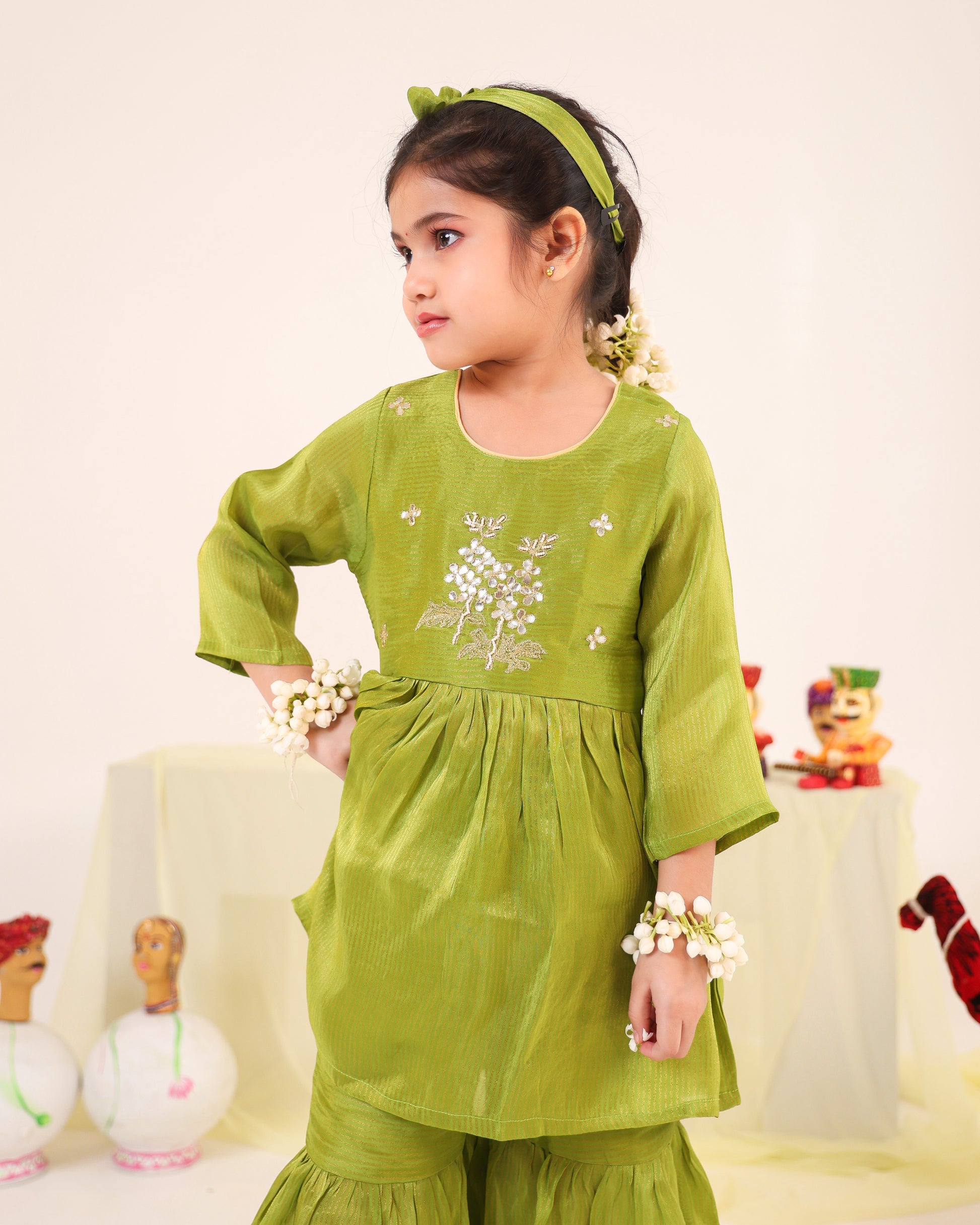 This kurta style sharara set is one of the all time favorite for all festivals . The easy to wear kurta with a elasticated sharara with zari embroidered motif make it traditional and unique. Kurta also adorns its beauty by special laces and embroidered yolk with stripy flary bottom.
